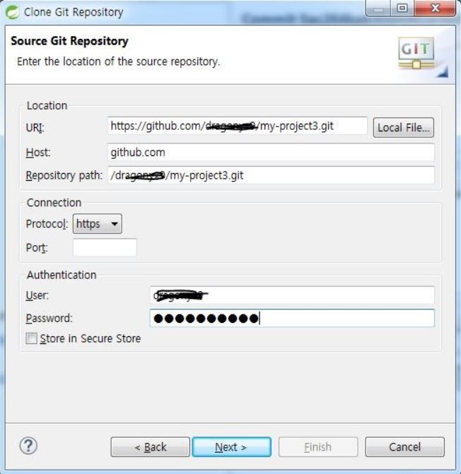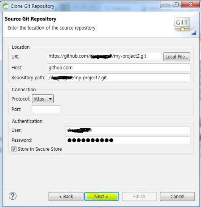 저장소를 생성한 후 보여지는 화면에서 저장소 주소 오른쪽의 아이콘을 누르면 자장소 설정이 복사되어 아래의 URI, Host, Repository path가 자동으로 입력된다. user와 password를 입력하고 Store in Secure Store를 체크한 후 [Next]를 누른다.