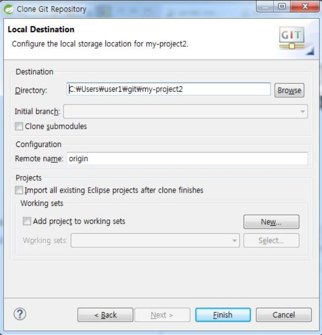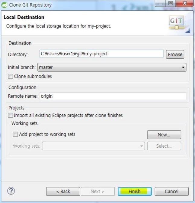 희망하는 곳에 로컬 저장소를 설정하고 [Finish]를 누른다.