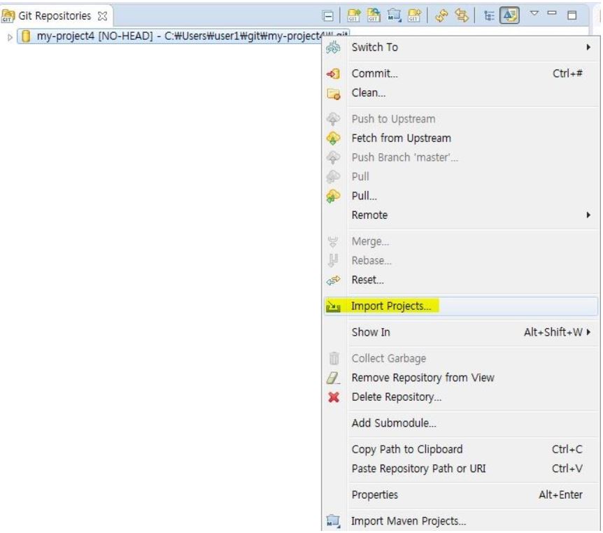 저장소 이름을 클릭한 후 마우스 오른쪽 버튼을 누르고 Import Porjects 클릭