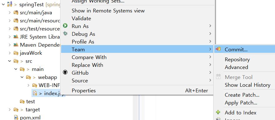 프로젝트를 파일을 올리기 위해 프로젝트명을 클릭하고 마우스 오른쪽 버튼을 툴러 team>commit를 선택한다.