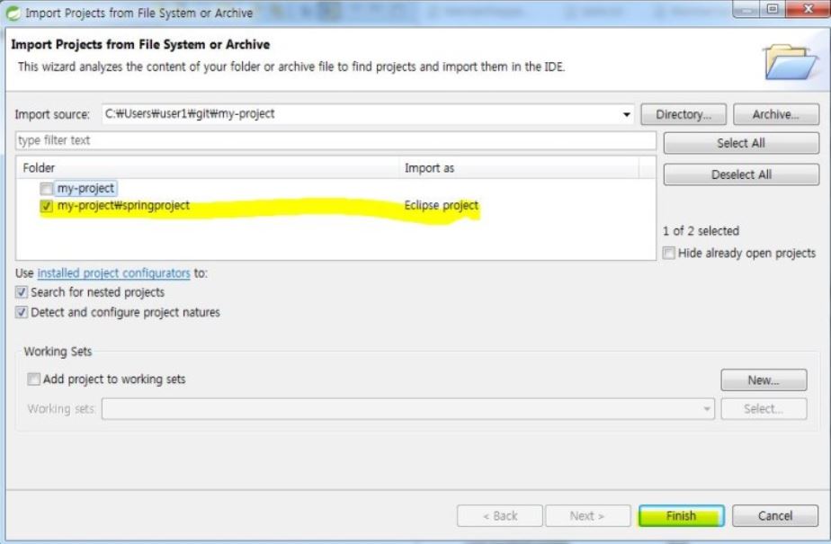 Eclipse project만 체크하고 [Finish]를 누른다.