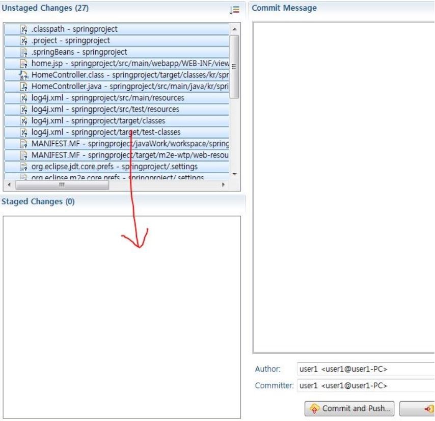 unstaged Changes 항목에 있던 파일을 전체 선택해서 Staged Changes로 옮긴다.