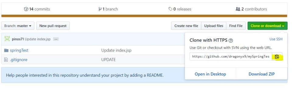 Git repositories 화면에서 Clone or download를 클릭해서 저장소 정보를 복사한다.