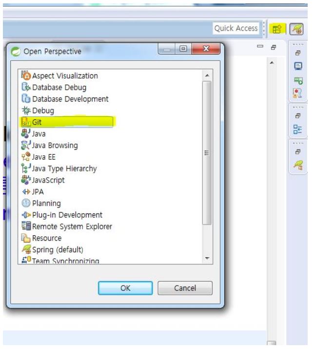 STS에서 프로그램 상단 우측의 아이콘을 클릭하여 Open Perspective 창을 구동한 후 Git 메뉴를 선택하고 OK 클릭