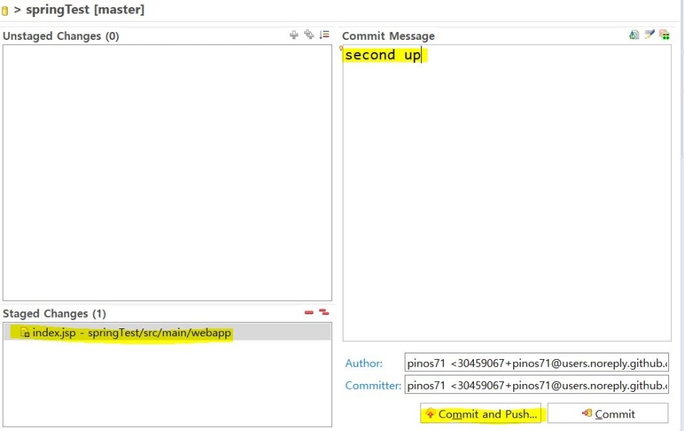 저장소로 업로드할 파일이 Staged Changes에 보여지고 Commit Message를 작성한 후 Commit and Push를 클릭한다.
