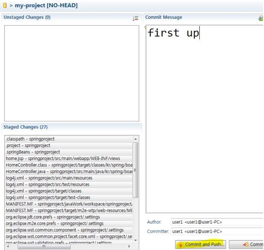 Commit Message를 입력하고 Commit and Push를 클릭한다.