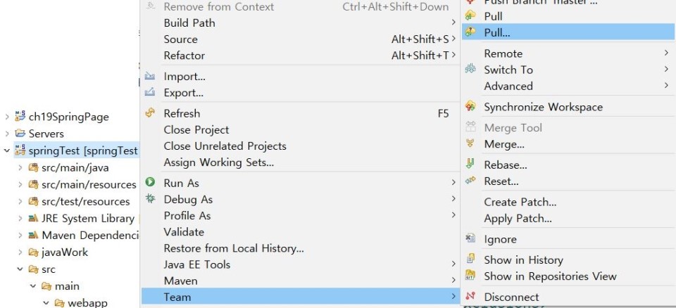 프로젝트명을 클릭했을 경우는 team>pull를 클릭하고 하위 폴더를 클릭했을 경우는 team>Repository>Pull을 클릭한다.