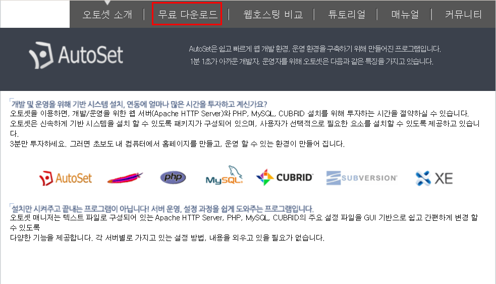 오토셋을 이용하면, 개발/운영을 위한 웹 서버(Apache HTTP Server)와 PHP, MySQL, CUBRID 설치를 위해 투자하는 시간을 절약하실 수 있습니다. 오토셋은 신속하게 기반 시스템을 설치 할 수 있도록 패키지가 구성되어 있으며, 사용자가 선택적으로 필요한 요소를 설치할 수 있도록 제공하고 있습니다. 3분만 투자하세요. 그러면 초보도 내 컴퓨터에서 홈페이지를 만들고, 운영 할 수 있는 환경이 만들어 집니다. 오토셋 매니저는 텍스트 파일로