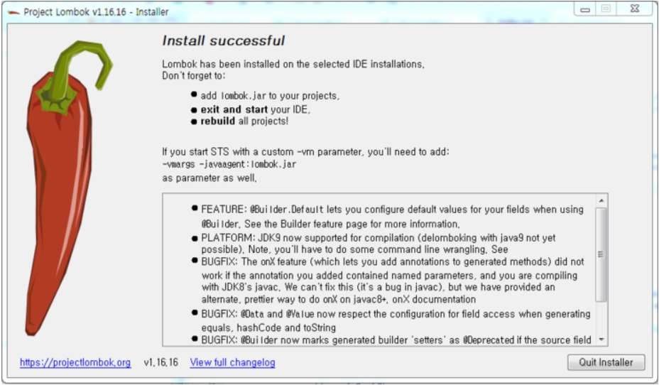 Lombok를 설치하려면 사용중이 STS를 종료한다. 아래 명시한 Lombok 사이트를 방문해서 파일을 다운로드 받는다.