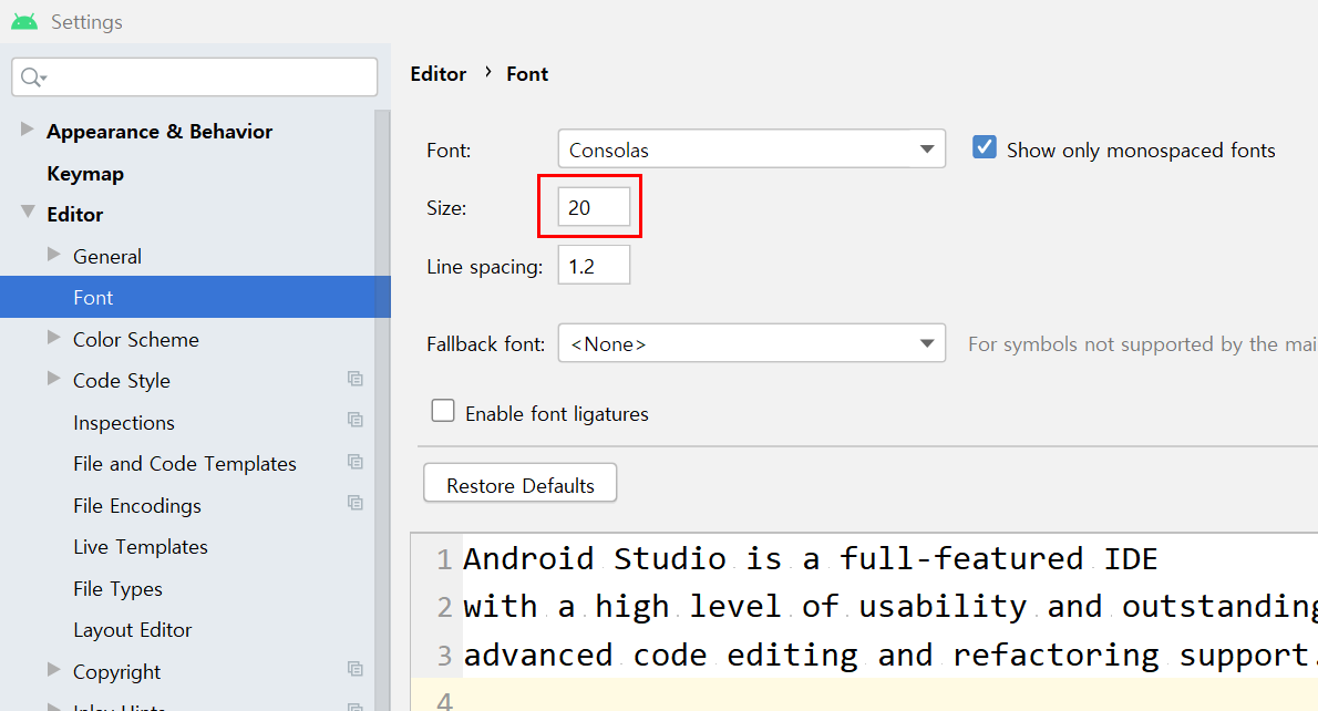 Settings 화면에서 Editor의 Font 항목을 선택하고 Size를 변경하면 글자의 크기를 변경할 수 있다.