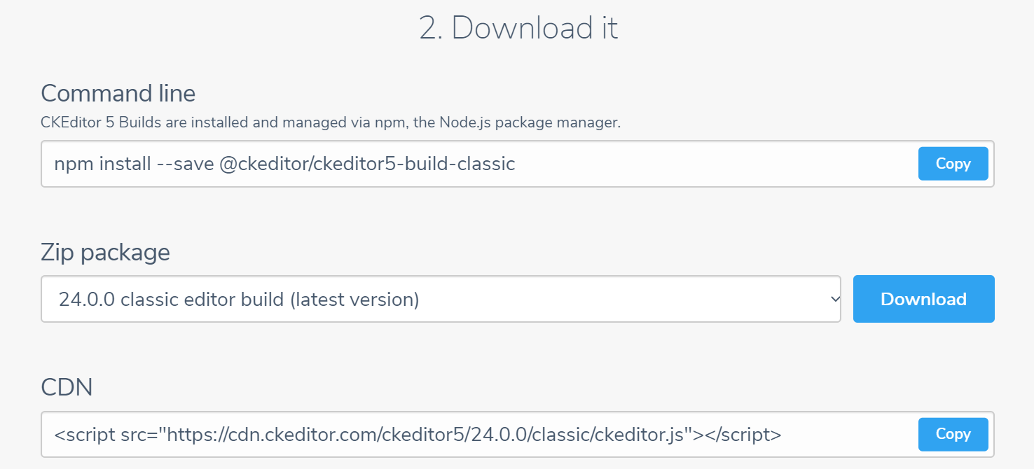 Command line은 명령 프롬프트에서 npm install로 설치하는 방식이고 Zip package 는 zip파일로 다운로드하는 방식으로 압축을 풀어 ckeditor.js 를 사용하면 된다. CDN은 script 태그에 표시된 URL를 사용해서 CKEditor5의 기능을 이용하는 방식이다.