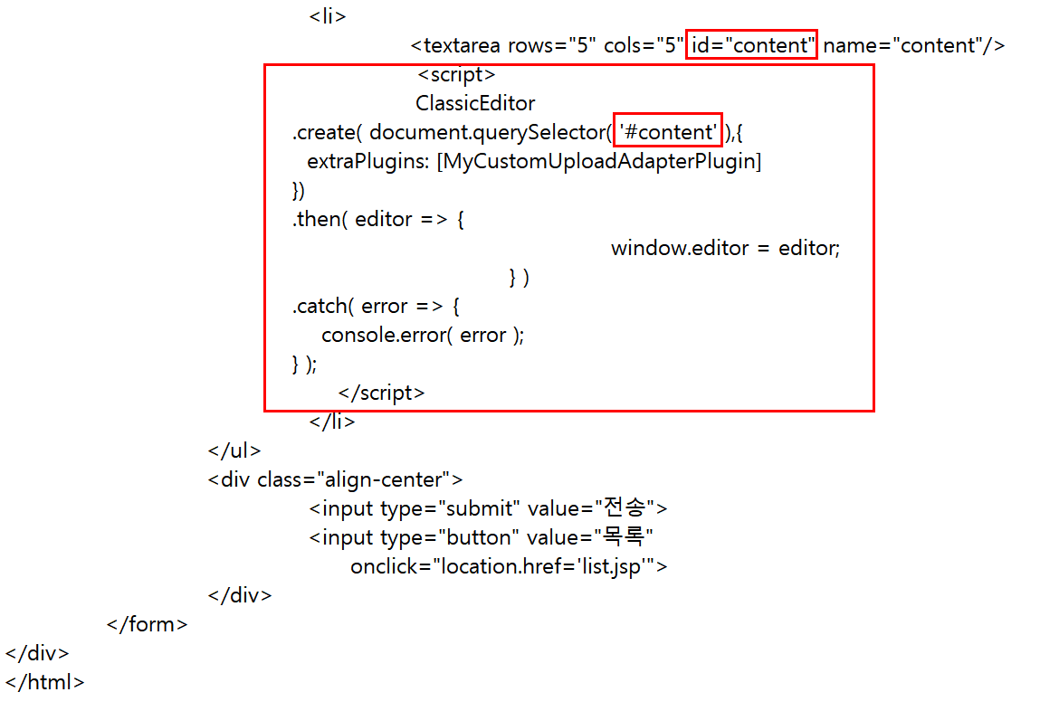 textarea에 id를 content로 지정하고 <script> 태그 안의 document.querySelector 메서드에 content를 표시한다.