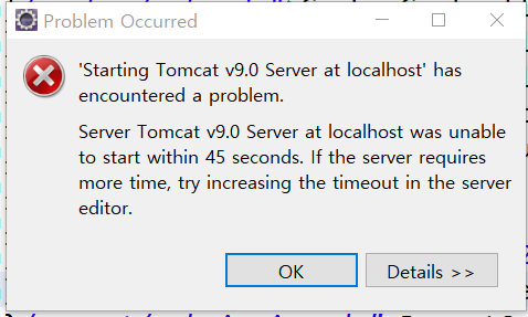 Tomcat를 구동시킬 때 아래 그림처럼 45초 내에 서버를 시작할 수 없어서 결국 timeout이 발생하고 정지될 때가 있다.