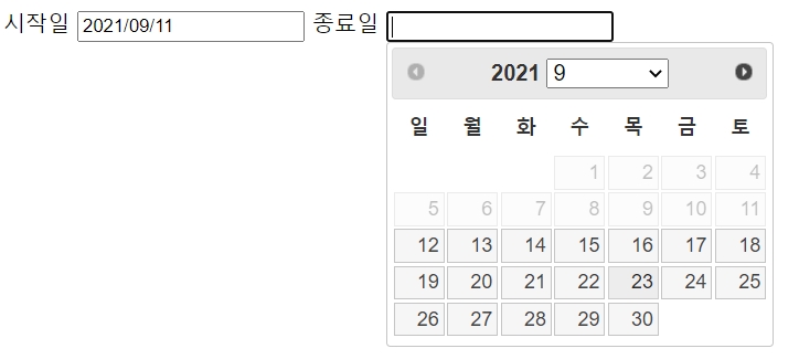 jQueryUI의 datepicker를 이용해서 시작일과 종료일을 지정할 때 원하는 기간을 선택할 수 있도록 제한할 수 있다.