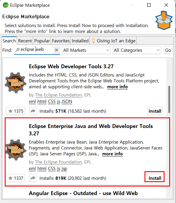 Eclipse Marketplace에서 eclipse web를 검색하고