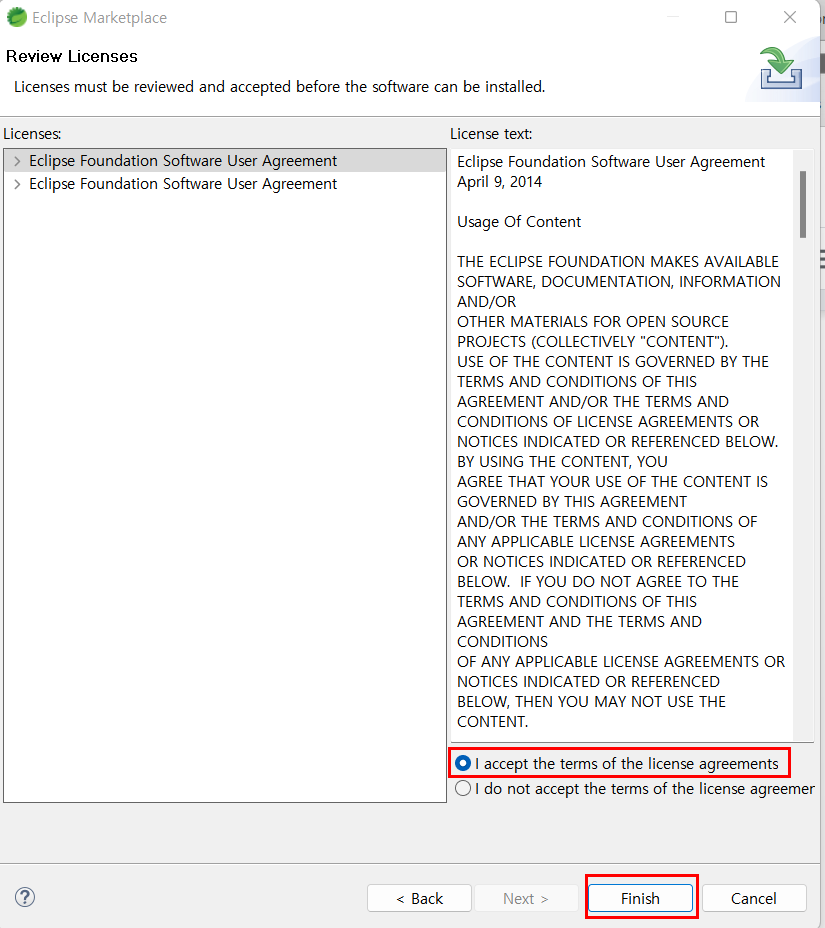 라이센스 동의하고 [Finish] 버튼을 클릭한다.