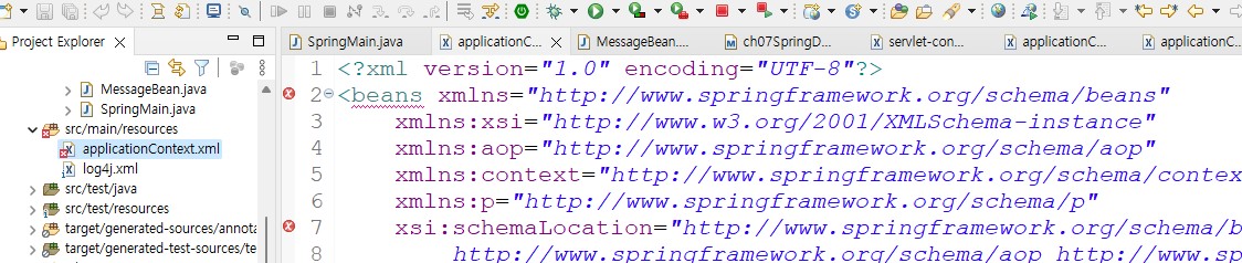 spring xml 파일에서 cvc-elt.1.a: Cannot find the declaration of element 'beans'. 오류 발생 본문