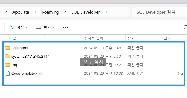 이런 경우 C:\Users\사용자명\AppData\Roaming\SQL Developer 폴더로 이동하여 폴더내의 모든 파일을 삭제 한 후 다시 구동한다.